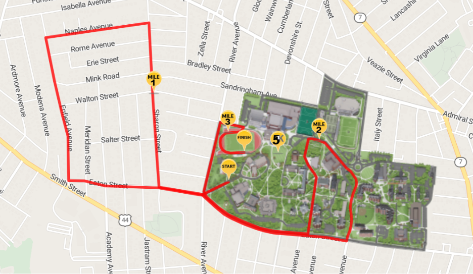 • Saturday, October 4, 11 a.m. – Friar 5k road race/walk. While most of the route is on campus, the first leg will see runners/walkers on some of the neighborhood streets in Ward 14 (Eaton St., Enfield St., Naples Ave., Sharon St., and River Ave back to Eaton St.). That part of the race will be done in about an hour, so by noon, the neighborhood streets should be clear. We are working with Providence Police and our own Public Safety officials to provide traffic control and security for the race, as we have done in the past. A map of the 5k route is attached for your reference.